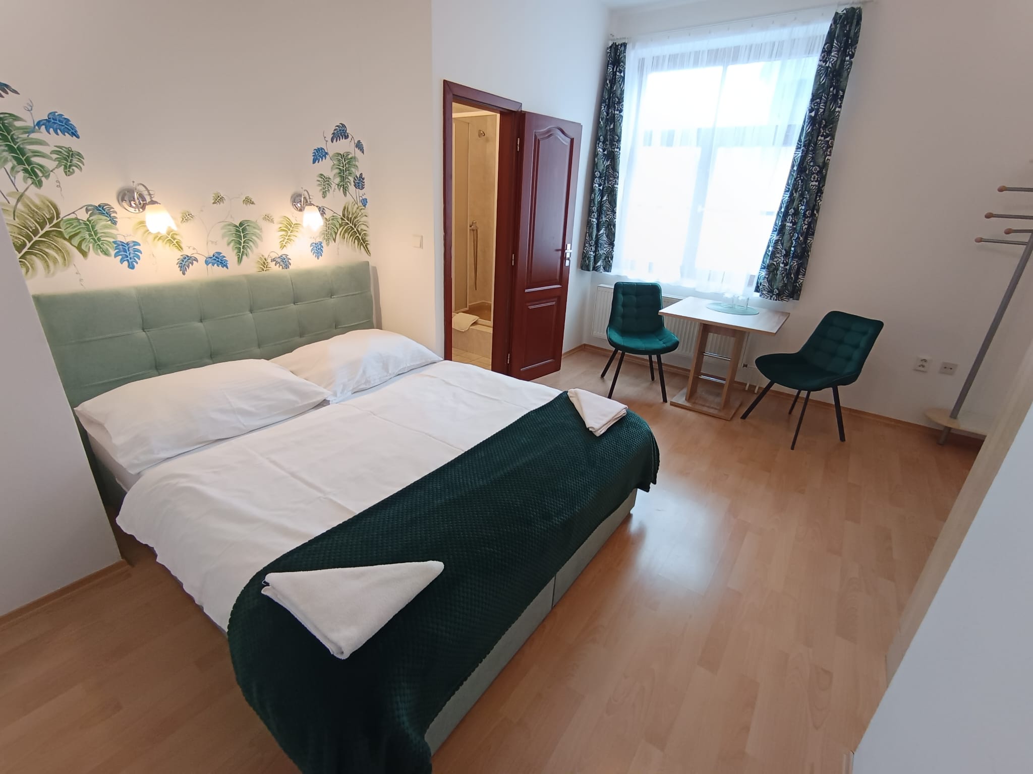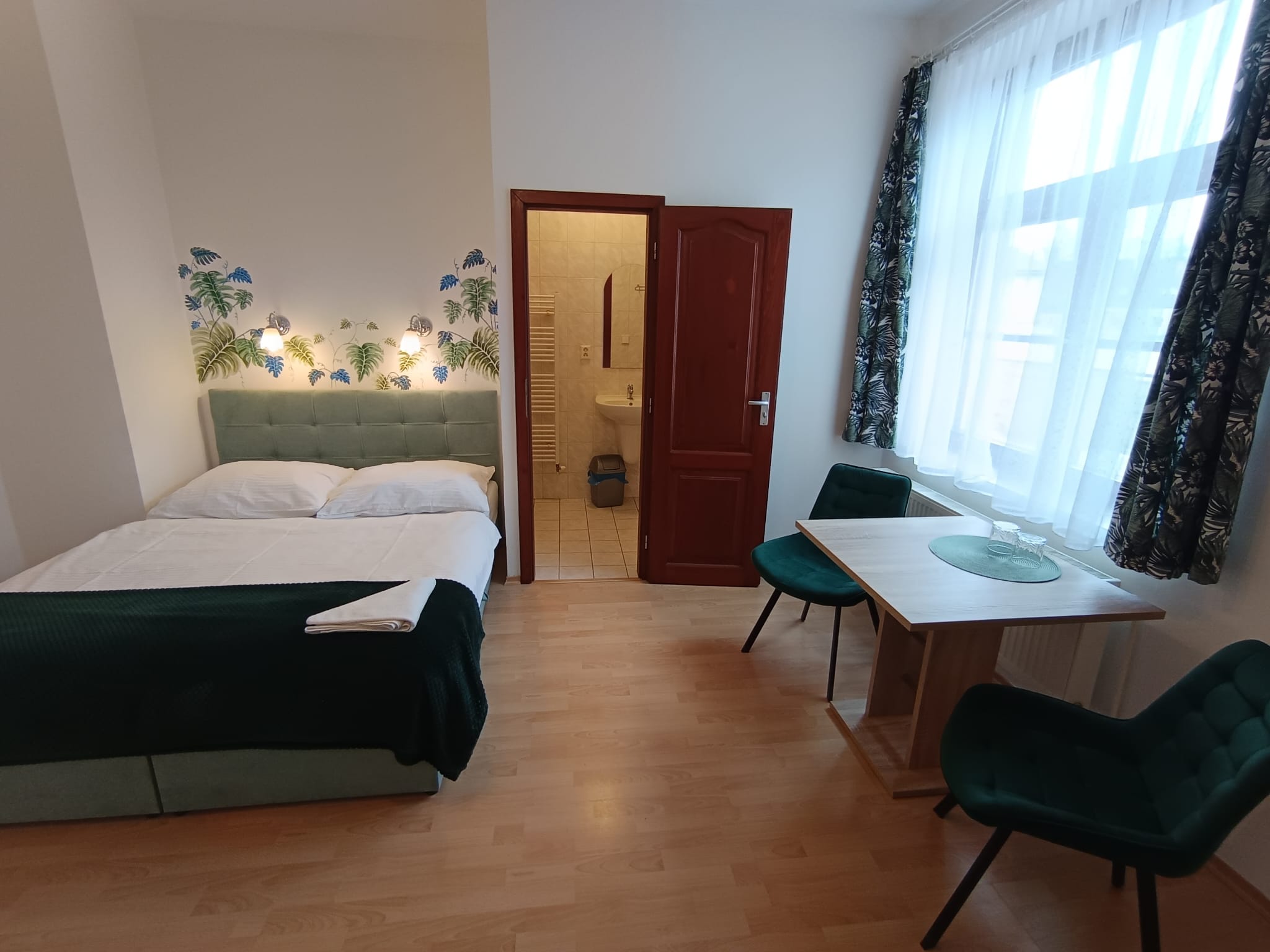 A small cozy room suitable for couples with a sitting area and a private bathroom.